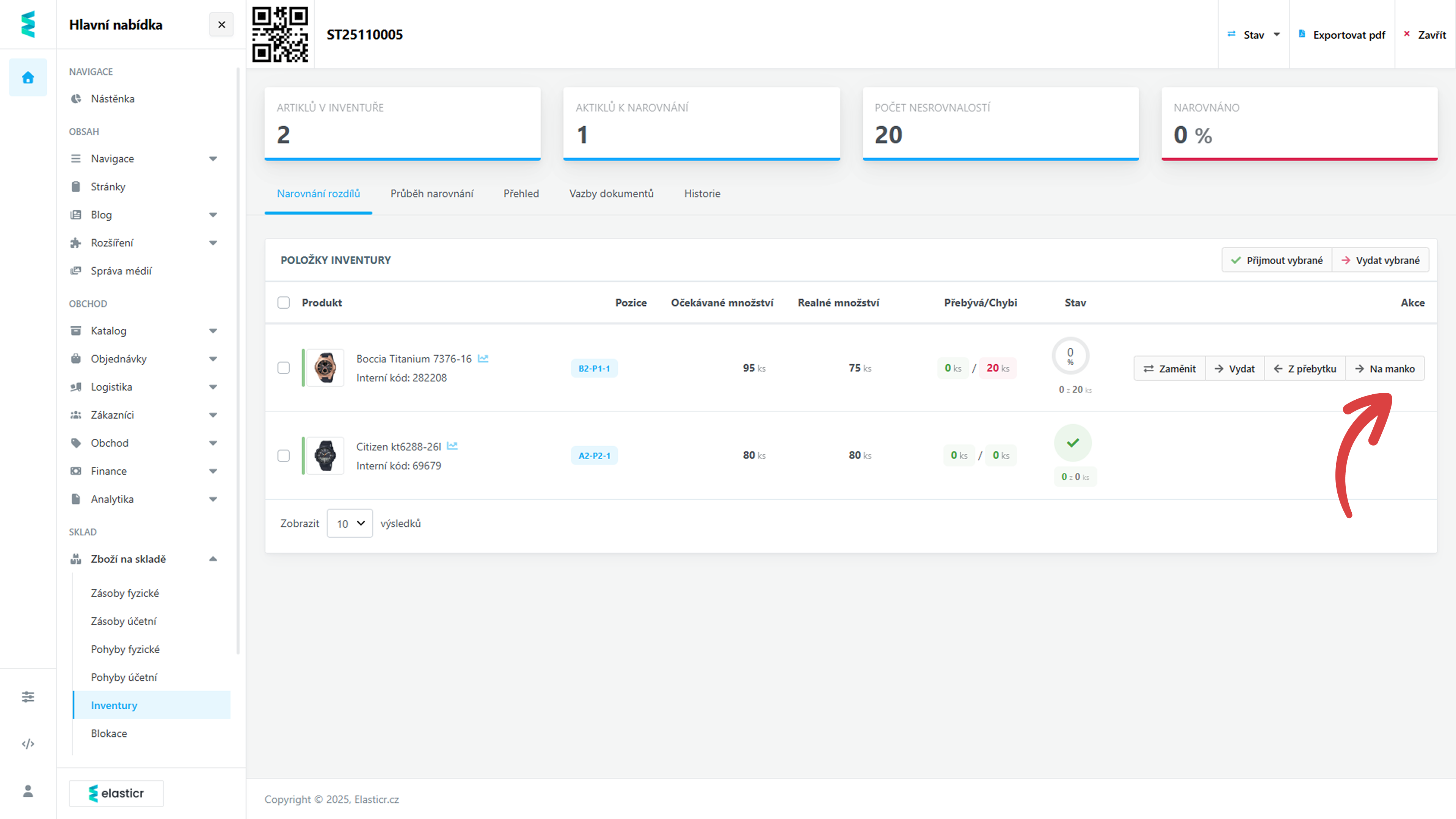 Místo okamžitého přičítání nebo odepisování zásob tak rozdíly nejdříve přehledně evidujete a až po prověření je vyrovnáte (např. přesunem zboží zpět nebo potvrzením manka).