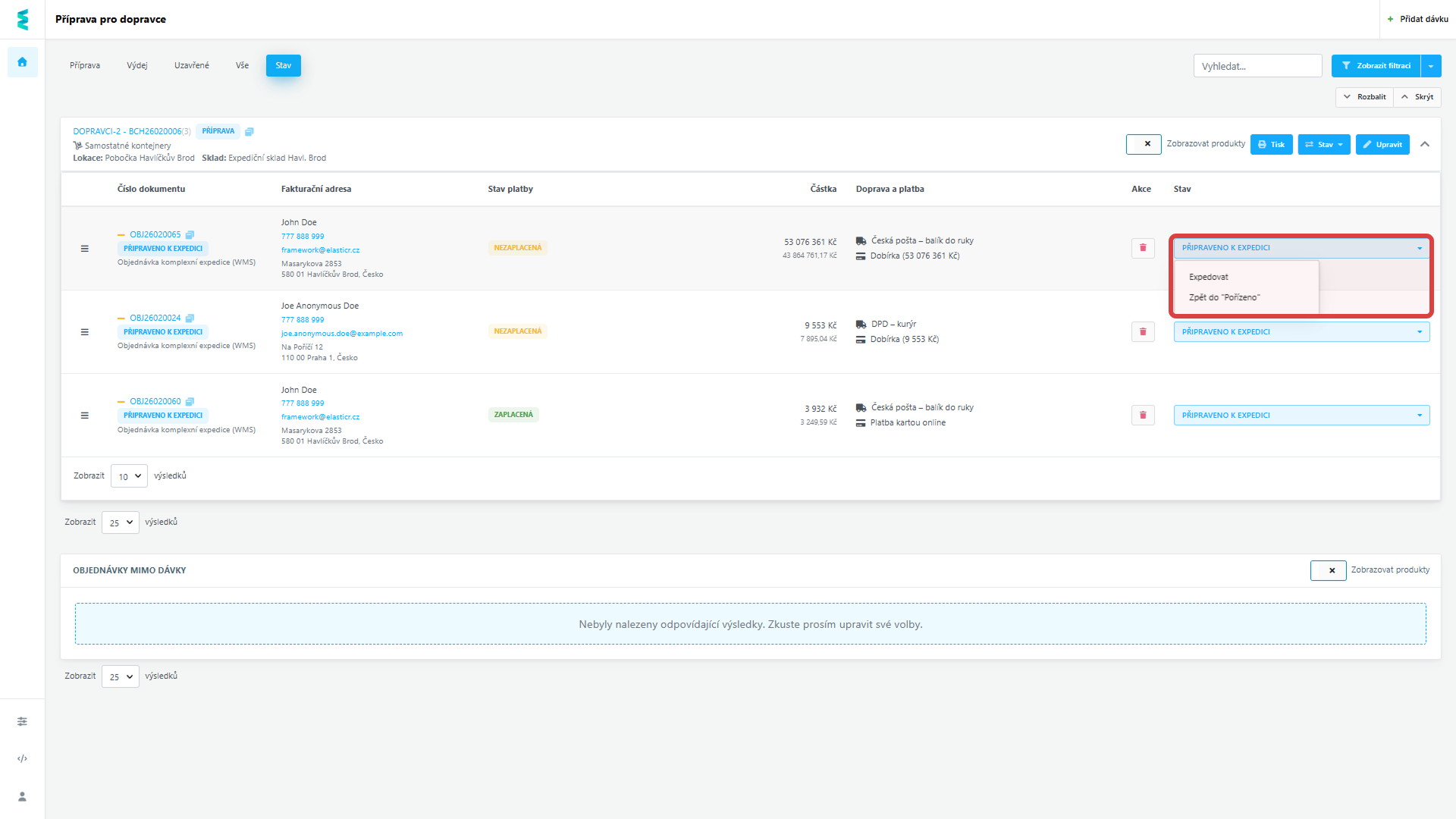 Nově můžete stavy jednotlivých objednávek měnit přímo v celkovém výpisu dávky, aniž byste se museli proklikávat do jejich detailu. Stačí u konkrétní zakázky zvolit v dropdown menu požadovaný status a změna se okamžitě projeví.