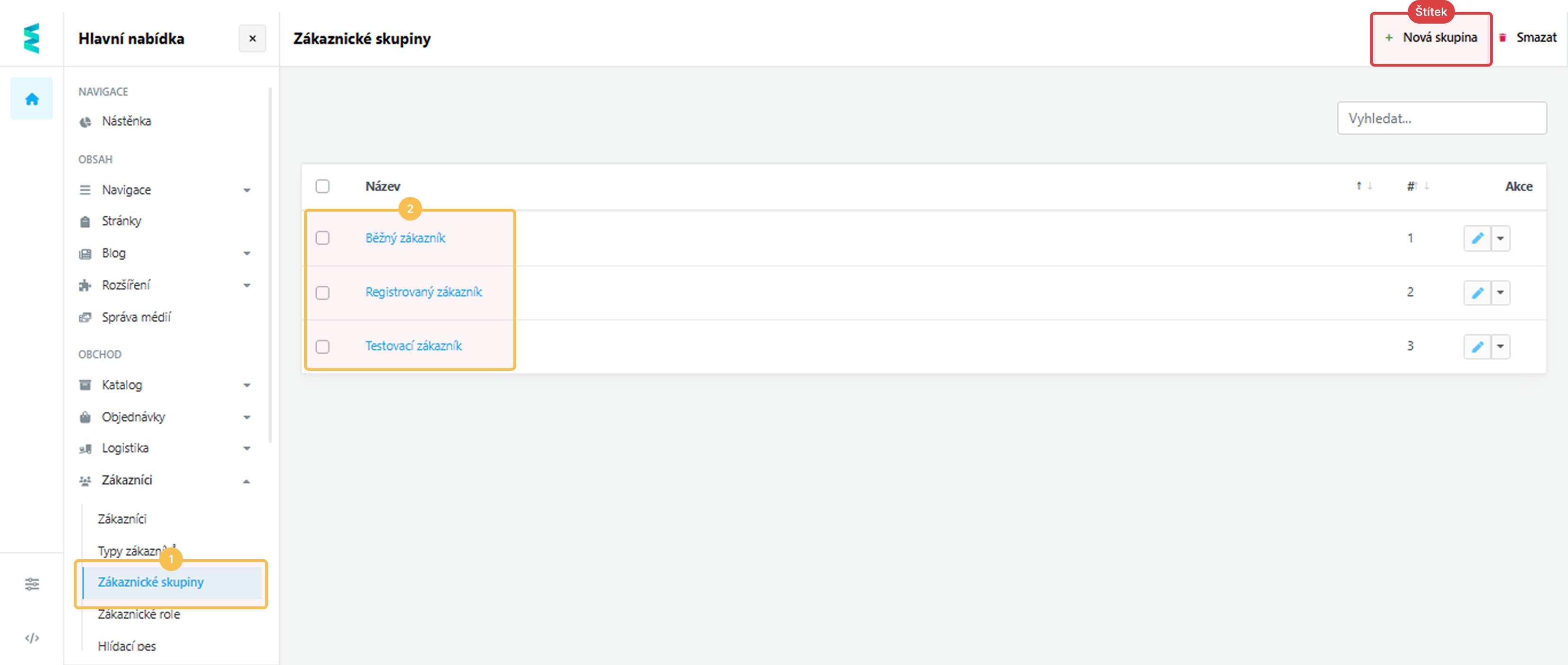 Hl. nabídka > Zákazníci > Zákaznické skupiny> Výběr konkrétní skupiny.