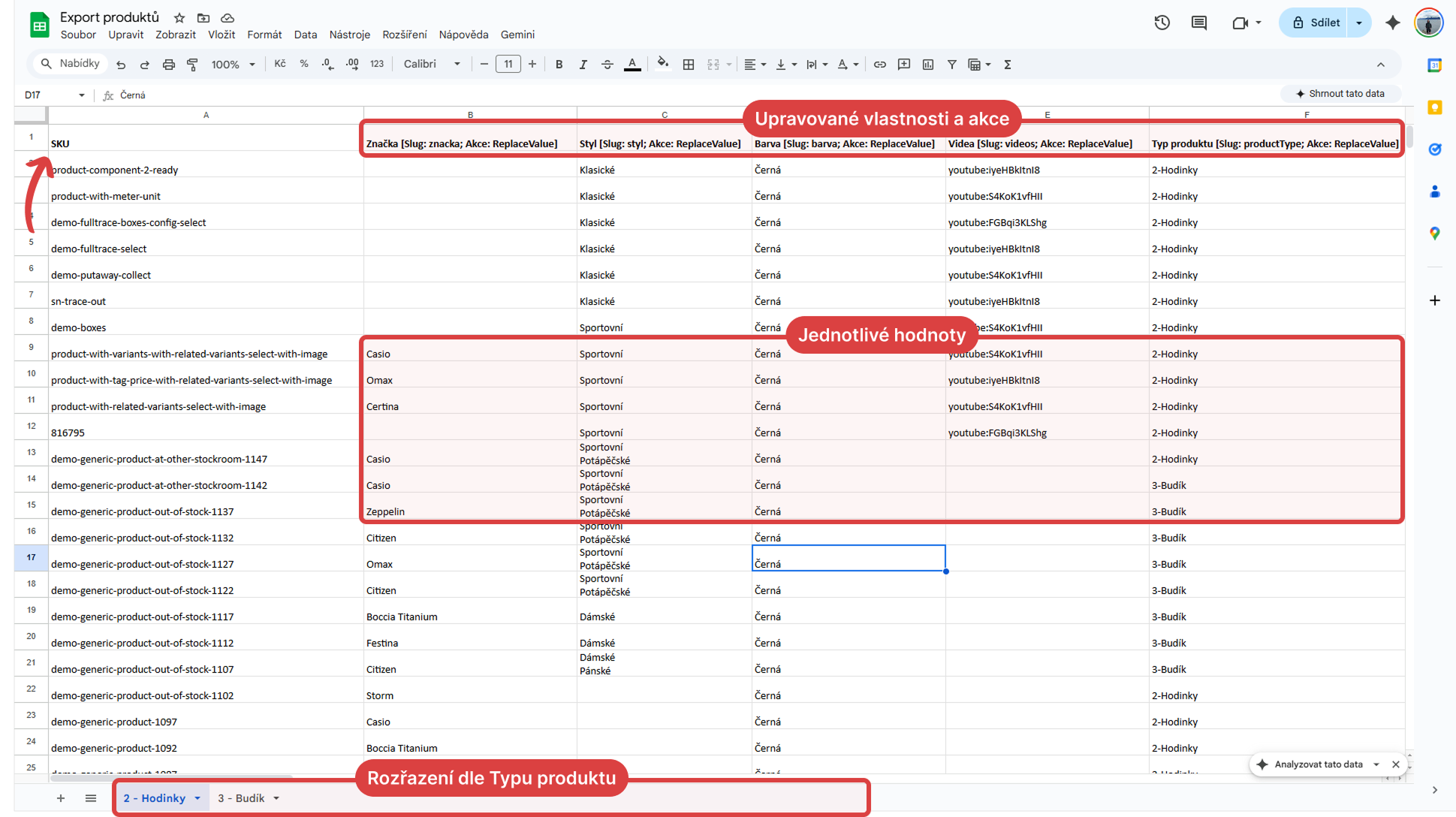 Tato funkce umožňuje spravovat data stovek až tisíců produktů najednou v prostředí tabulek (např. Excel nebo Google Sheets). Je to ideální nástroj pro rychlé aktualizace rozsáhlého katalogu bez nutnosti ruční editace produktů jednoho po druhém v administraci.