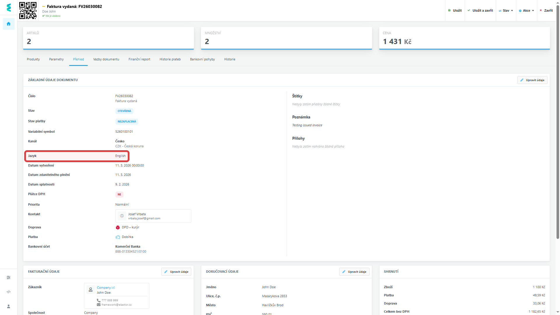 PDF doklady se nyní automaticky generují v jazyce, který pro daný dokument zvolíte, například v angličtině.