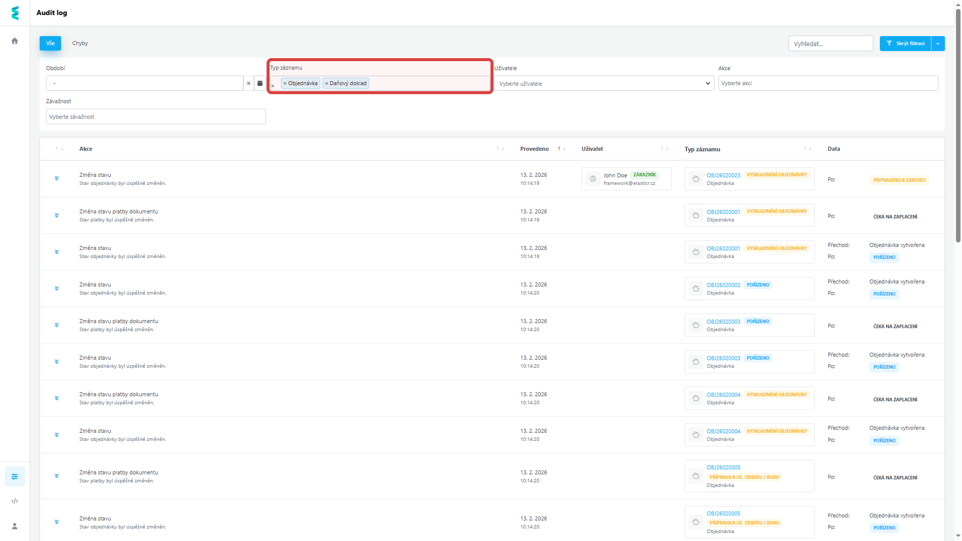 Do filtračních polí auditlogu: Akce, Typ záznamu a Závažnost je možné přidat více parametrů najednou a snadněji tak v něm lze dohledat proces či chybu, která vás zajímá.