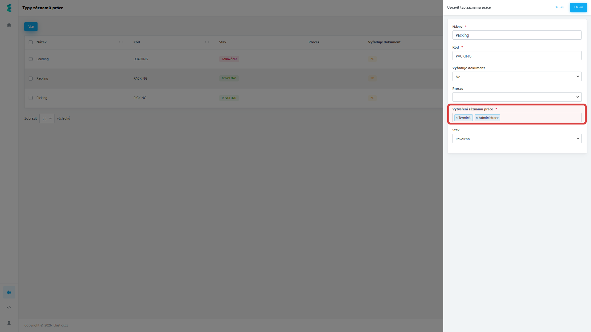 Příklad: Skladníkům lze nastavit právo pouze na „Zápis“. Jakmile aktivitu v terminálu ukončí, záznam se uzamkne a pro jakoukoli další změnu či smazání musí kontaktovat vedoucího skladu s patřičným oprávněním v administraci.