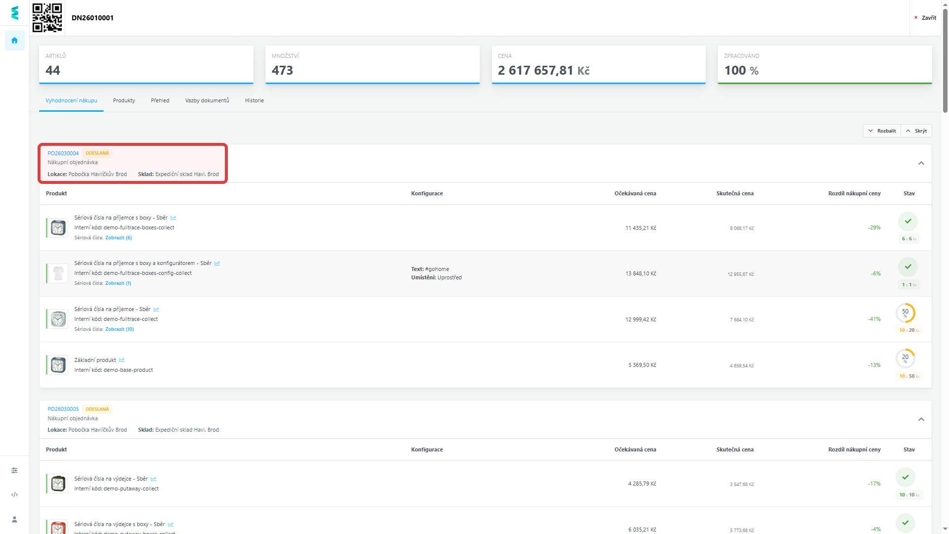 Nově se z detailu dodacího listu snadno prokliknete přímo na související nákupní objednávky. A to i v případě, že dodací list obsahuje položky z více různých objednávek (např. při sdružené dodávce od dodavatele).