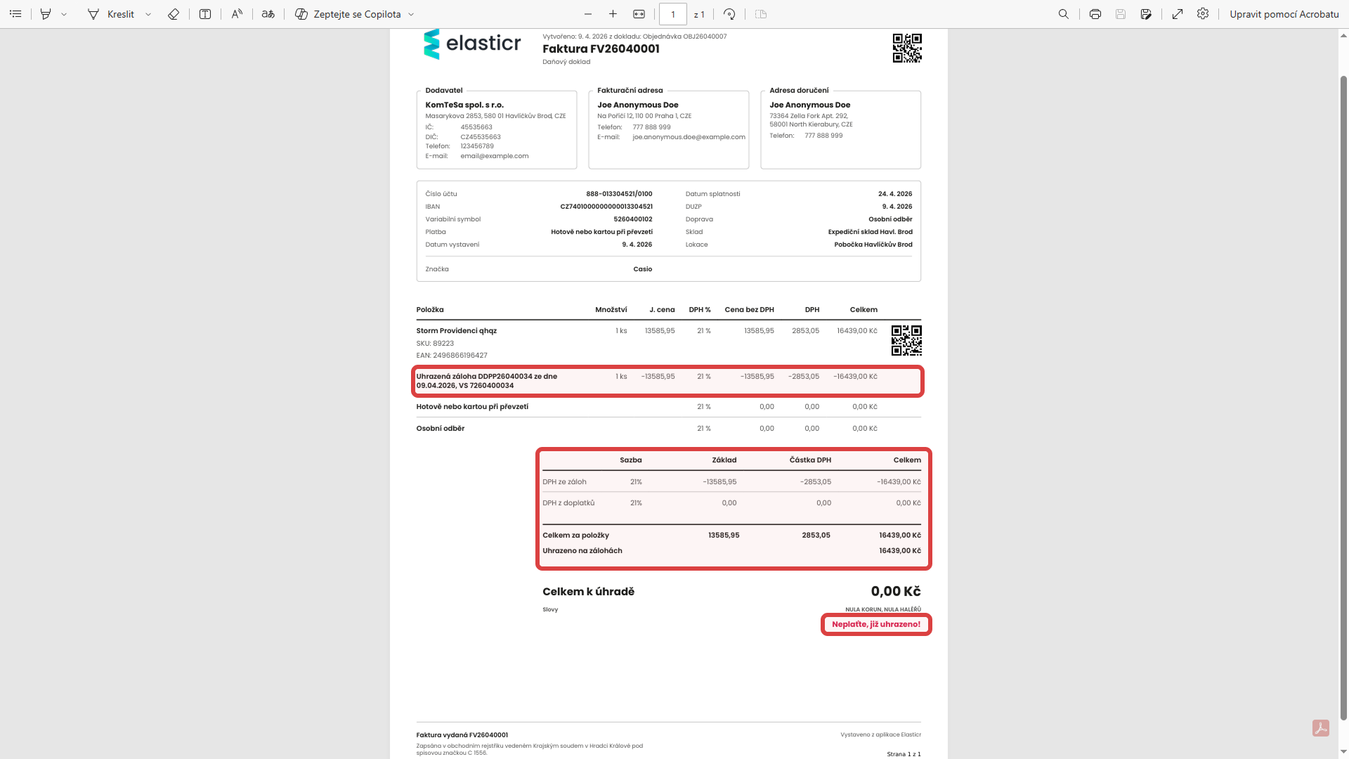 Přepracovali jsme vzhled PDF dokladů pro lepší přehlednost. Systém nyní jasně rozepisuje uhrazené zálohy a u zaplacených faktur zobrazuje upozornění „Neplaťte, již uhrazeno“.