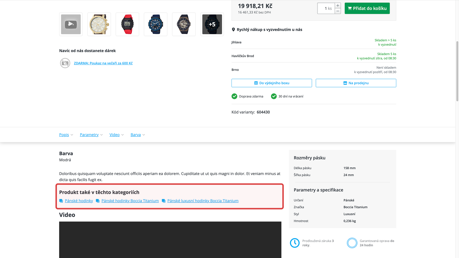 Na detail produktu jsme přidali možnost zobrazit seznam všech dalších kategorií, ve kterých je dané zboží zařazeno.