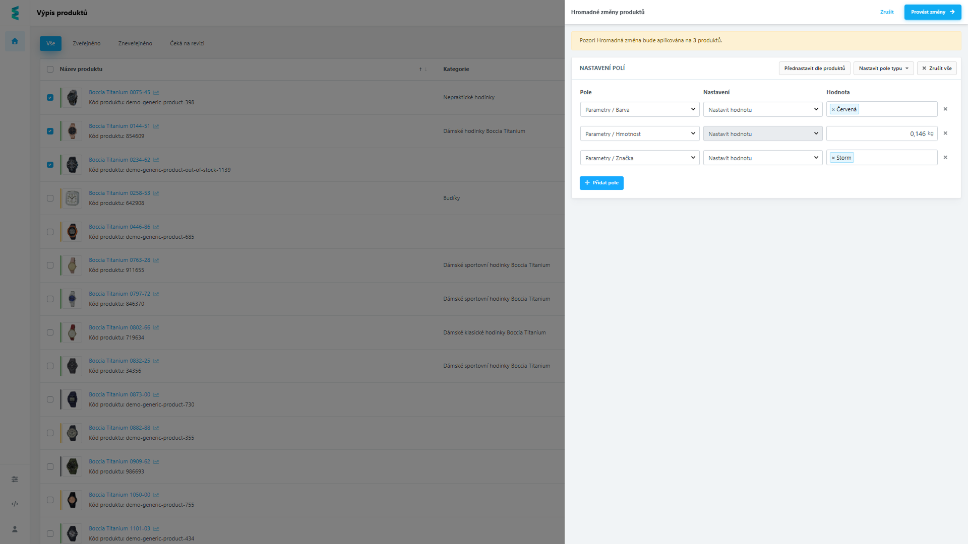 Kromě hromadných úprav přes XLSX soubory (představených v lednu) můžete nyní produkty upravovat také v administraci. Tato funkce umožňuje měnit, odebírat, nahrazovat nebo doplňovat nová data u desítek či stovek produktů najednou bez nutnosti exportu a importu tabulek.