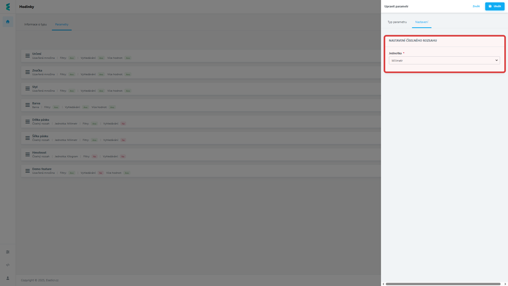Parametry jsou konkrétní vlastnosti navázané na Typ produktu.