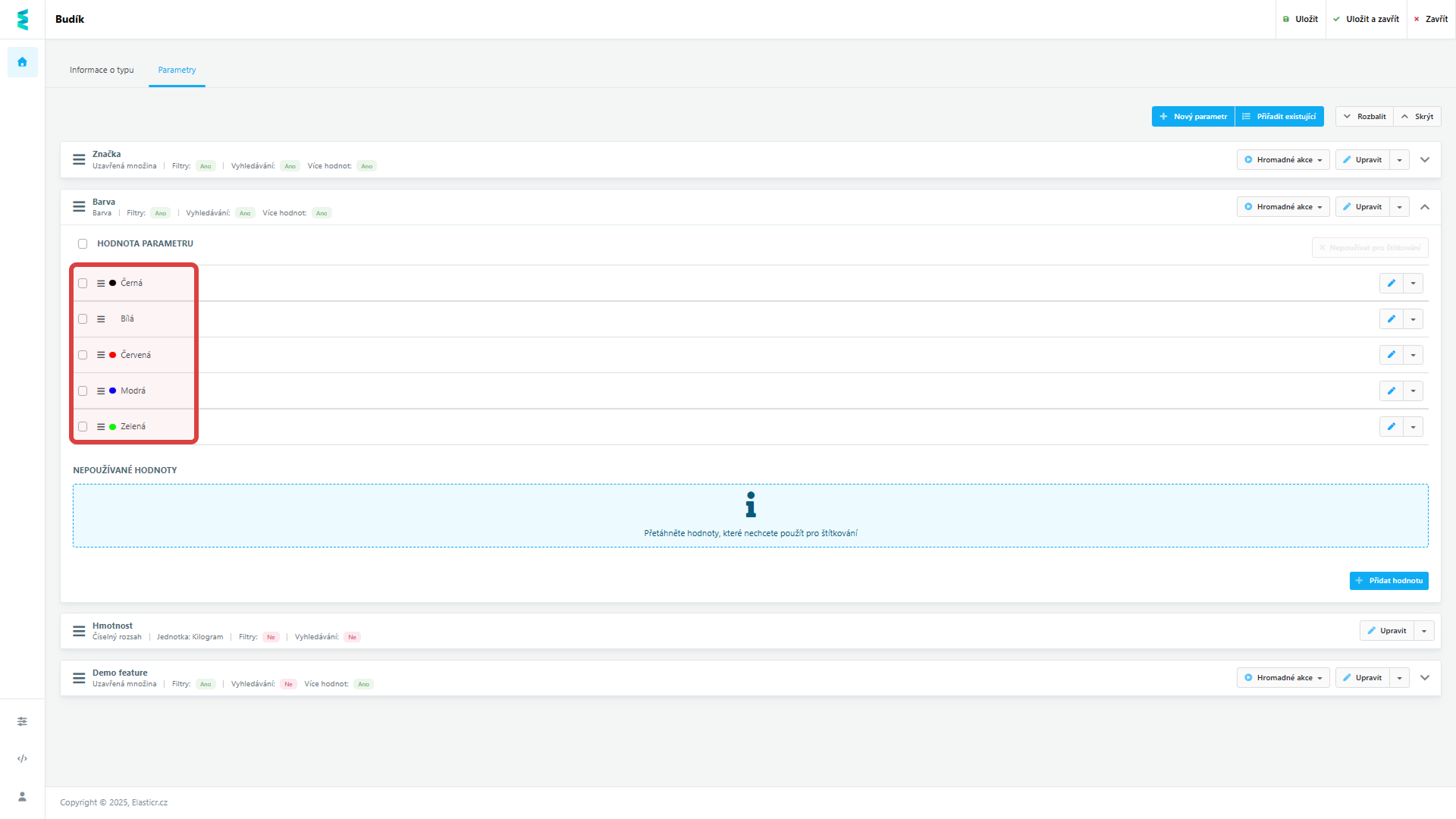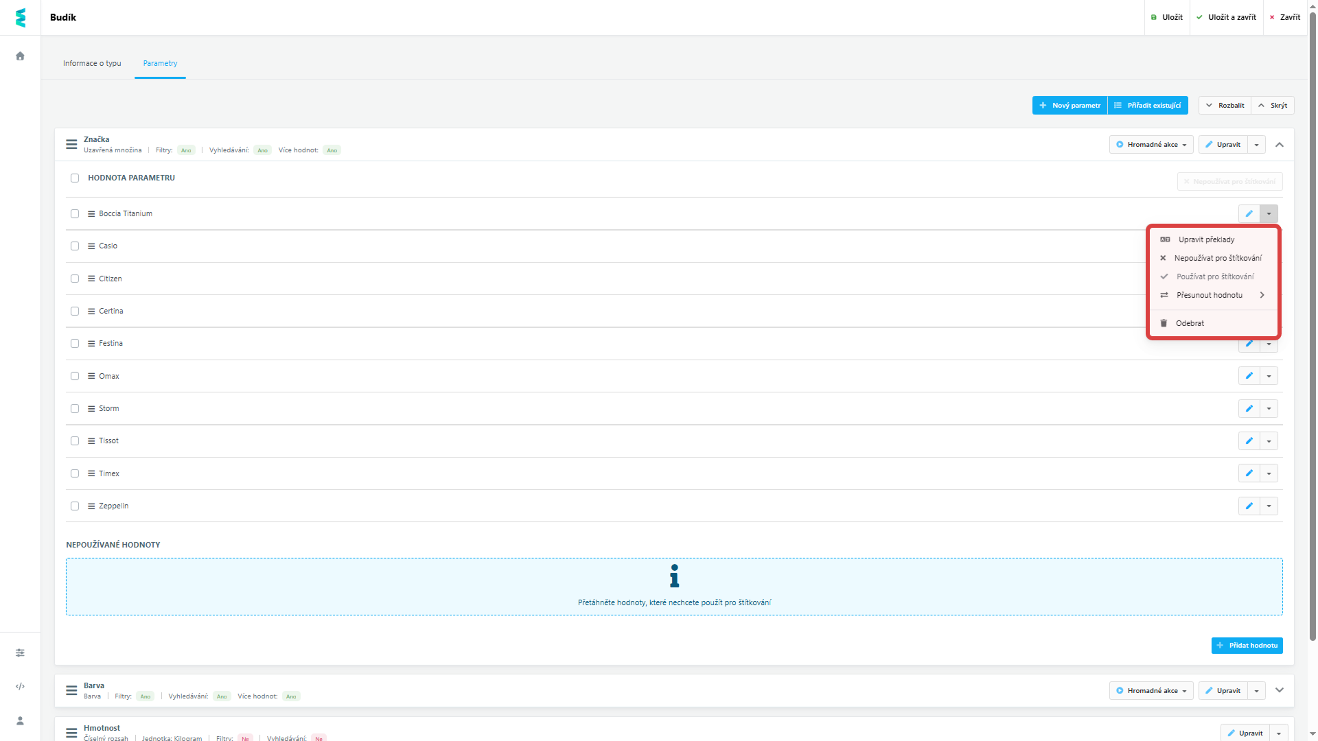 - Používané: Hodnoty v horní části seznamu jsou aktivní a uvidíte je v nabídce při administraci konkrétního produktu.