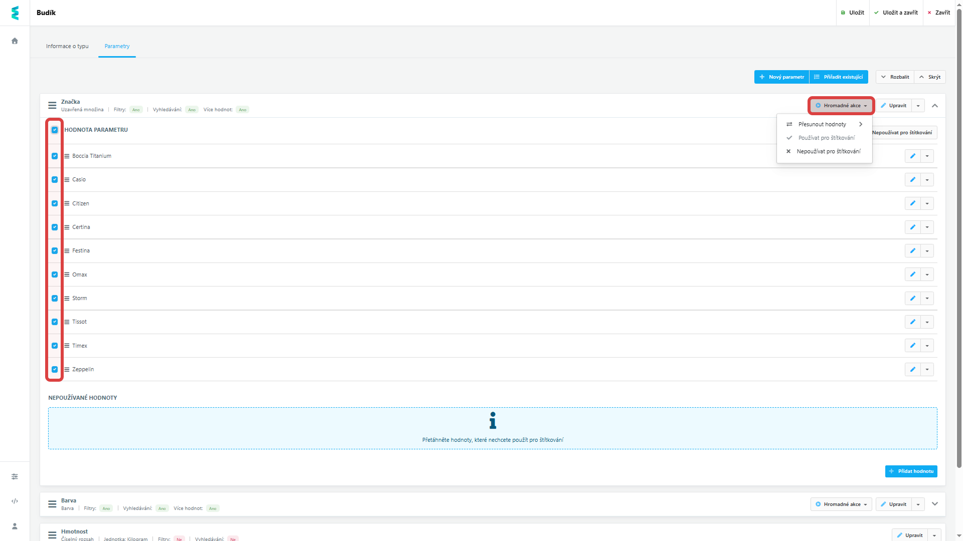Příklad: Máte společný parametr „Značka“. Pro typ produktu „Ložiska“ si aktivujete pouze relevantní výrobce (SKF, ZKL), zatímco ostatní přesunete do nepoužívaných. Administrátor pak při plnění ložisek není zahlcen stovkami značek, které s ložisky nesouvisí.