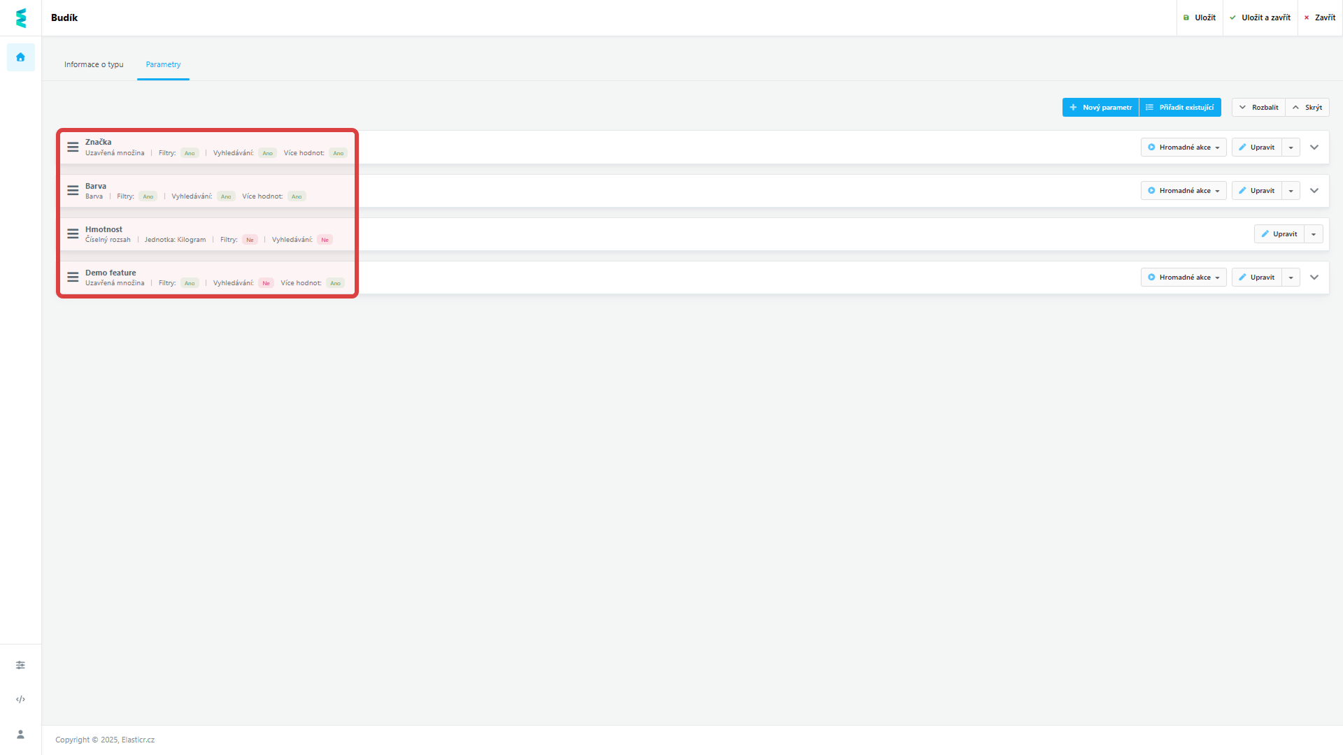 | Ve vyhledávání | Určuje, zda se má parametr nabízet k filtrování ve výsledcích vyhledávání (ANO/NE). |