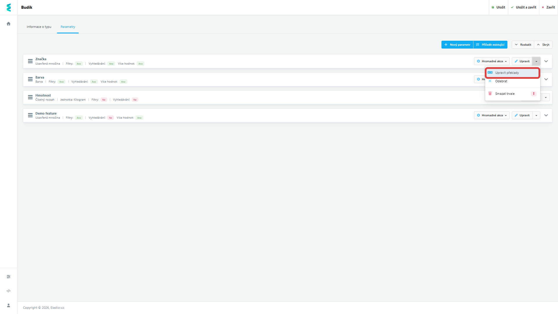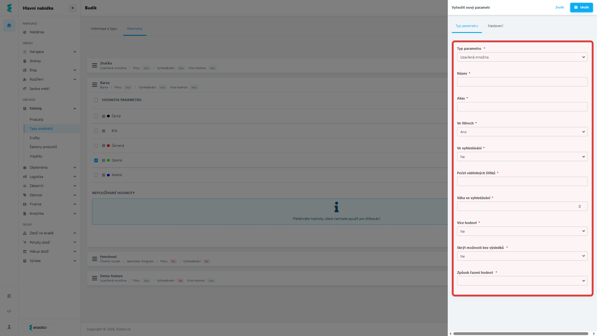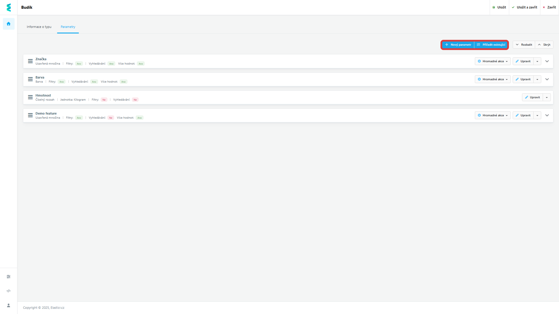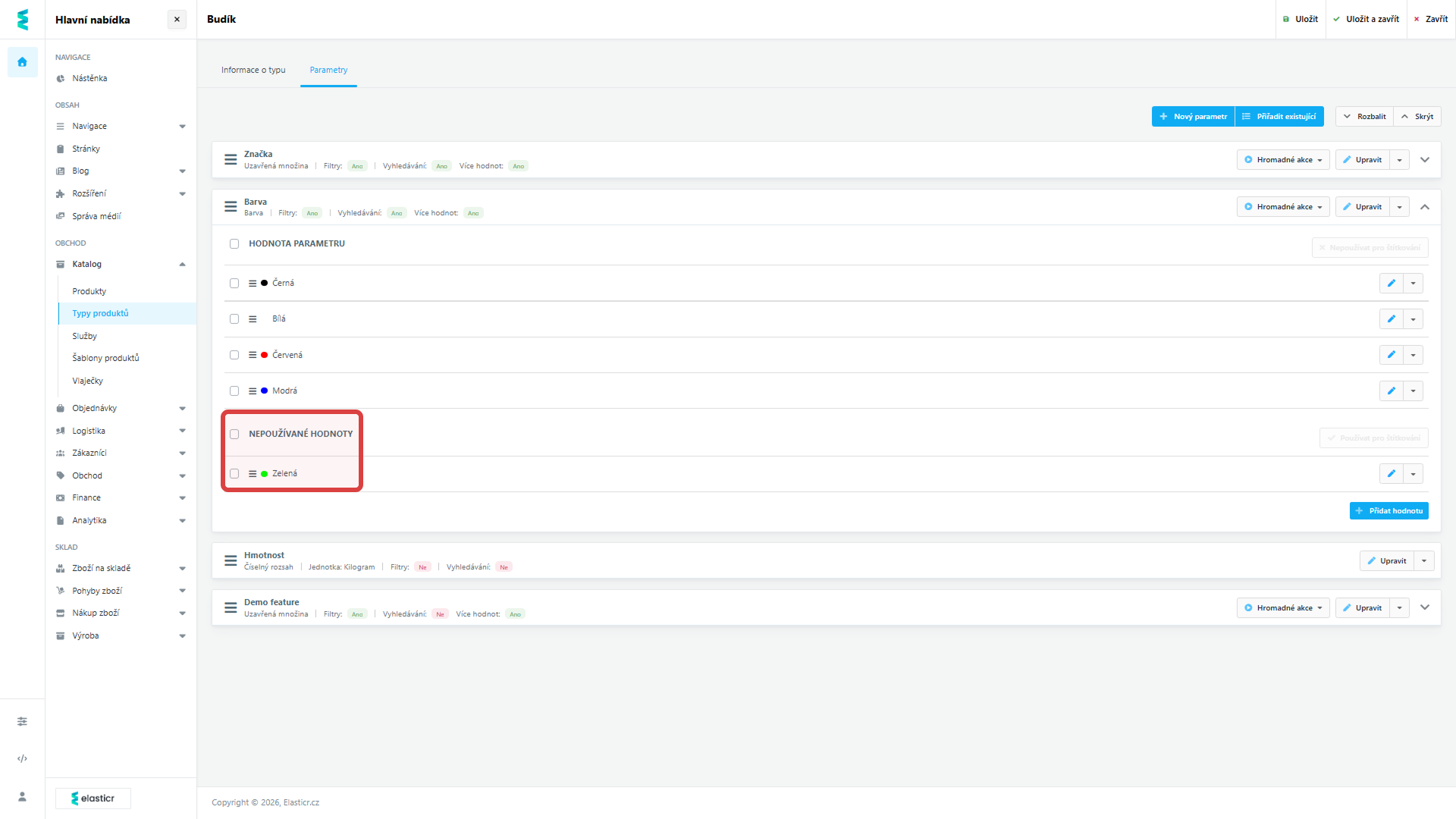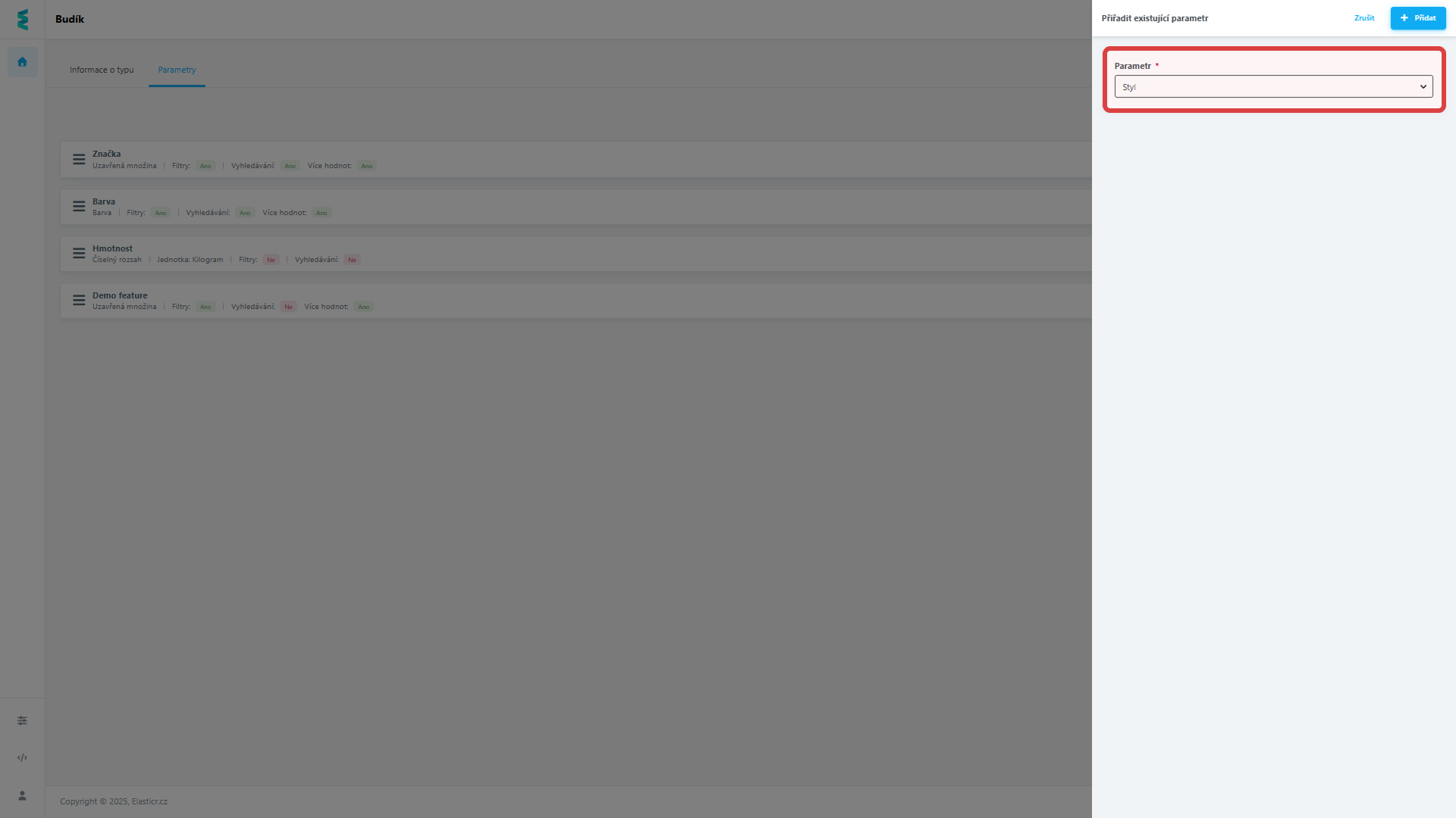 - Existující parametr: Pokud už parametr používáte u jiného typu produktu, nemusíte ho zakládat znovu. Jednoduše jej vyhledáte a přiřadíte i k tomuto typu.