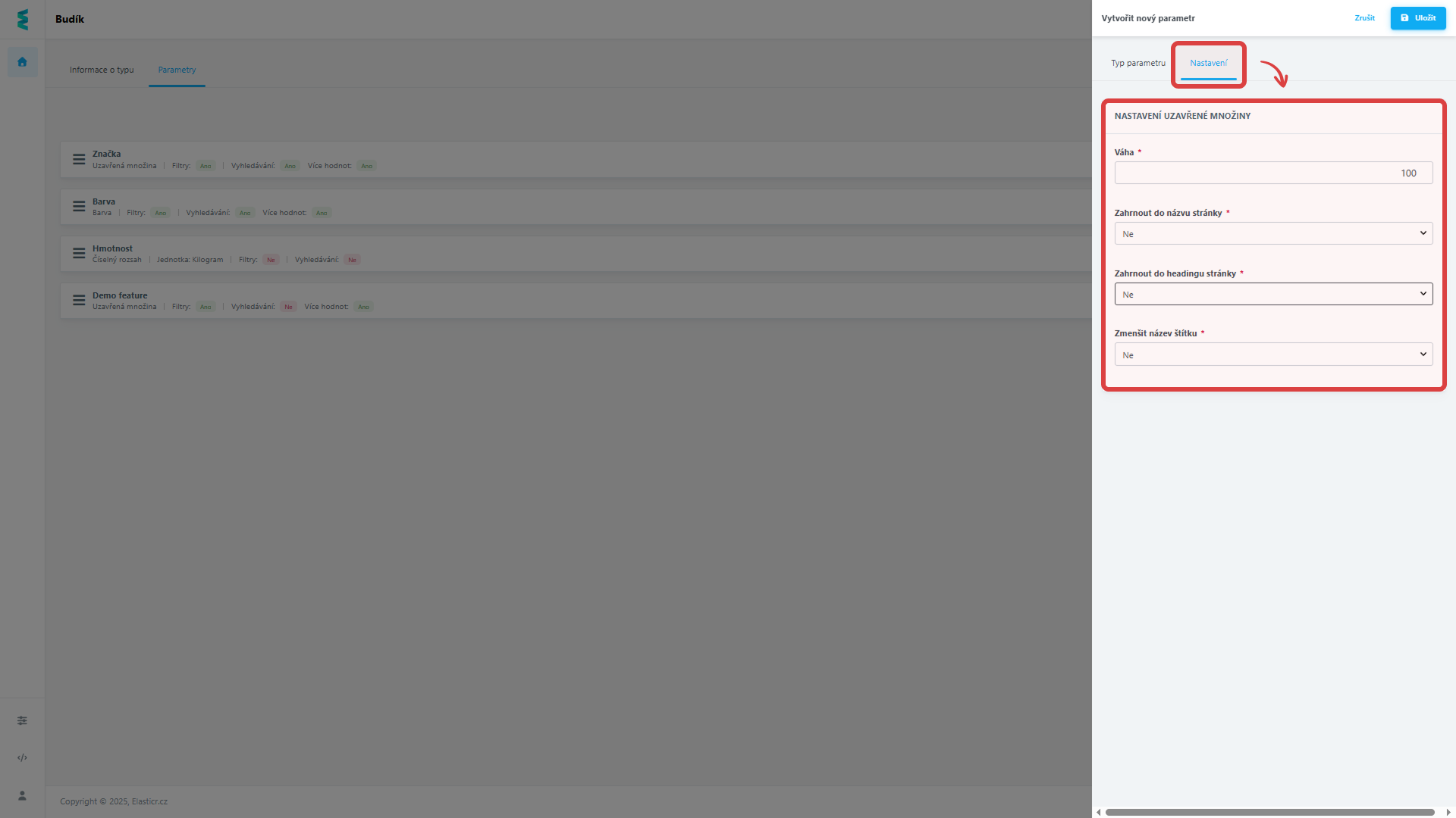 | Ve filtrech | Určuje, zda se má parametr zobrazovat v boční filtraci kategorií (ANO/NE). |