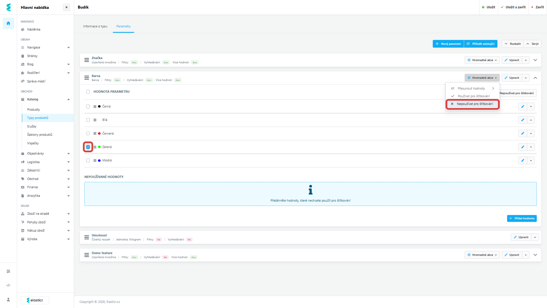- Nepoužívané hodnoty: Hodnoty, které přesunete do sekce “Nepoužívat pro štítkování”, se při administraci produktu nenabídnou.